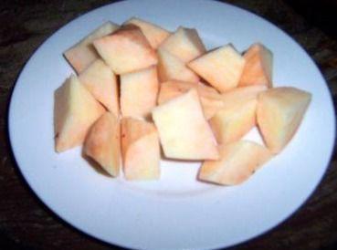 2. 地瓜去皮,切成滚刀块;茭瓜去皮,切成滚刀块。